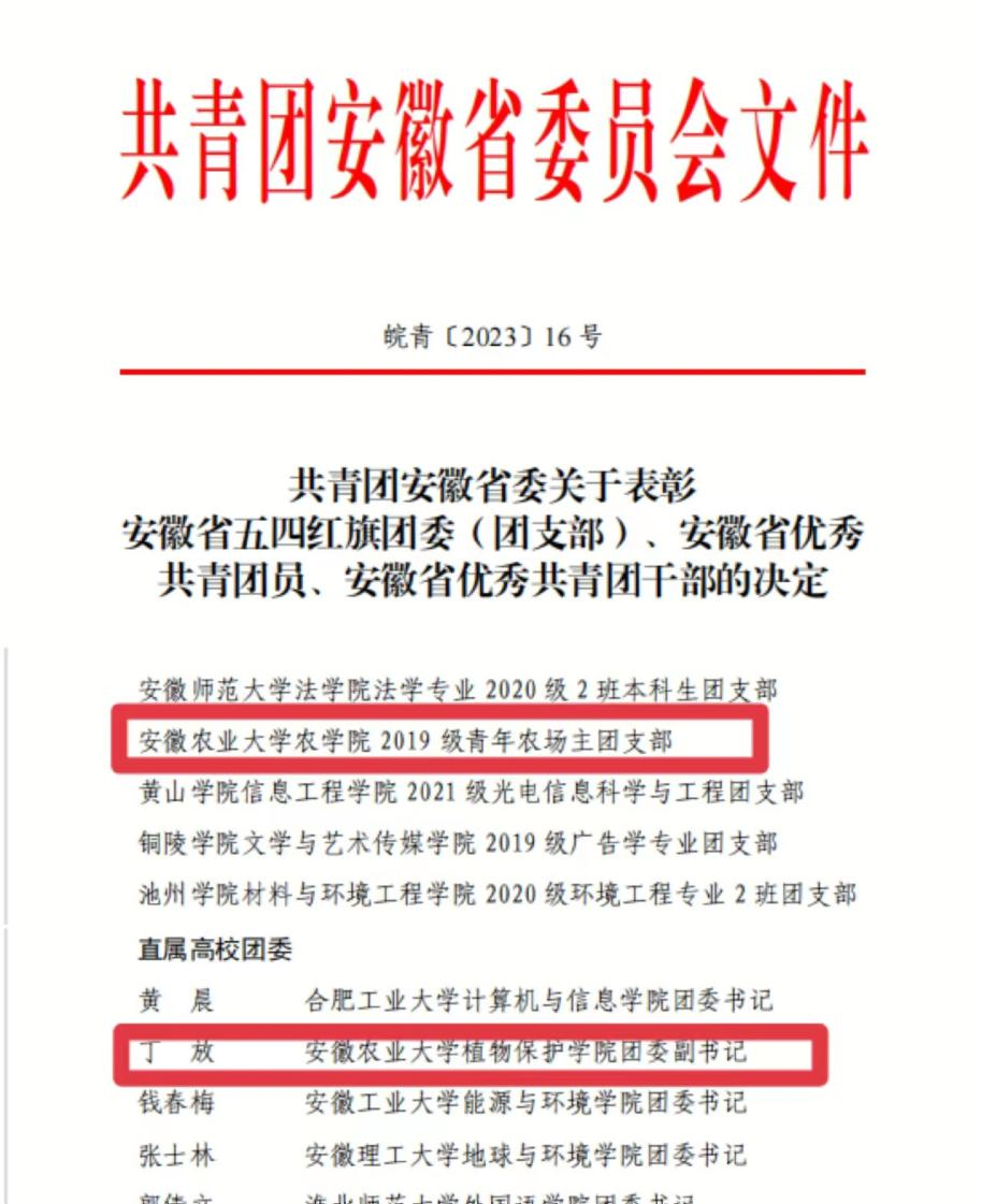 本网讯 近日,共青团安徽省委发布《关于表彰安徽省五四红旗团委(团支部)、安徽省优秀共青团员、安徽省优秀共青团干部的决定》。我校农学院2019级青年农场主团支部荣获“安徽省五四红旗团支部(团总支)”,植物保护学院团委副书记丁放荣获“安徽省优秀共青团干部”。