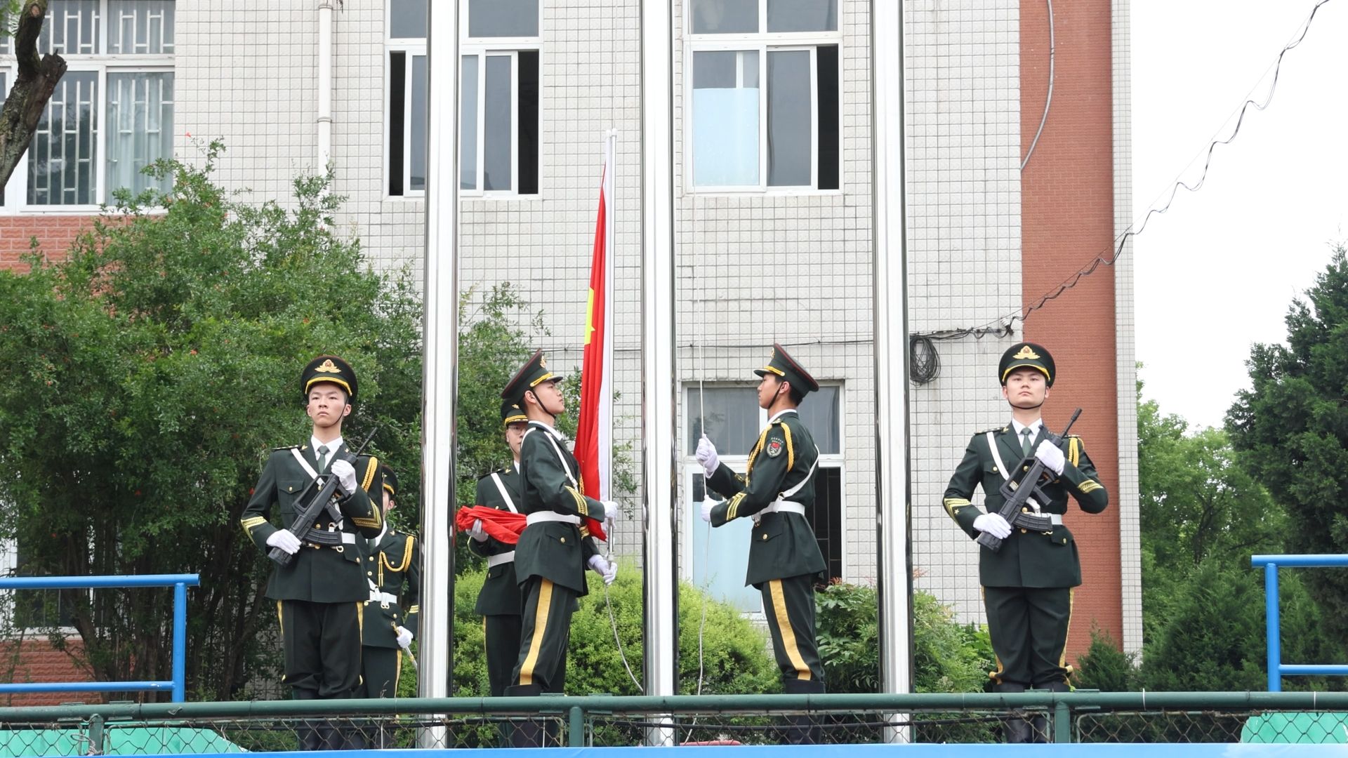 早上7时整,升旗仪式正式开始。国旗护卫队着装整齐,目光坚定,迈着整齐的步伐,护送鲜艳的五星红旗进场。全体师生整装肃立,行注目礼,齐唱国歌,以最崇敬的心情迎接五星红旗冉冉升起。