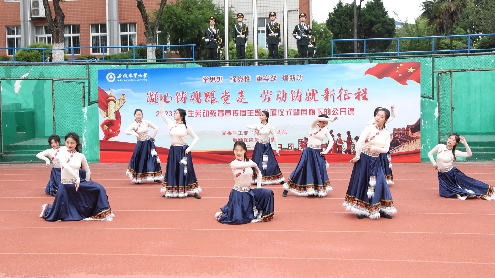 马克思主义学院王晶晶副教授以“何为劳动,劳动何为”为主题讲授国旗下的公开课《马克思主义劳动观》。来自大学生舞蹈团的学生代表,用一曲欢快的舞蹈《日出》,深情演绎了安农学子尊崇劳动、热爱劳动的精神风貌。来自教师代表们的诗朗诵《劳动者之歌》,讴歌了每一位勤劳的安农人,用点滴平凡汇聚成立德树人、服务育人的生动实践。