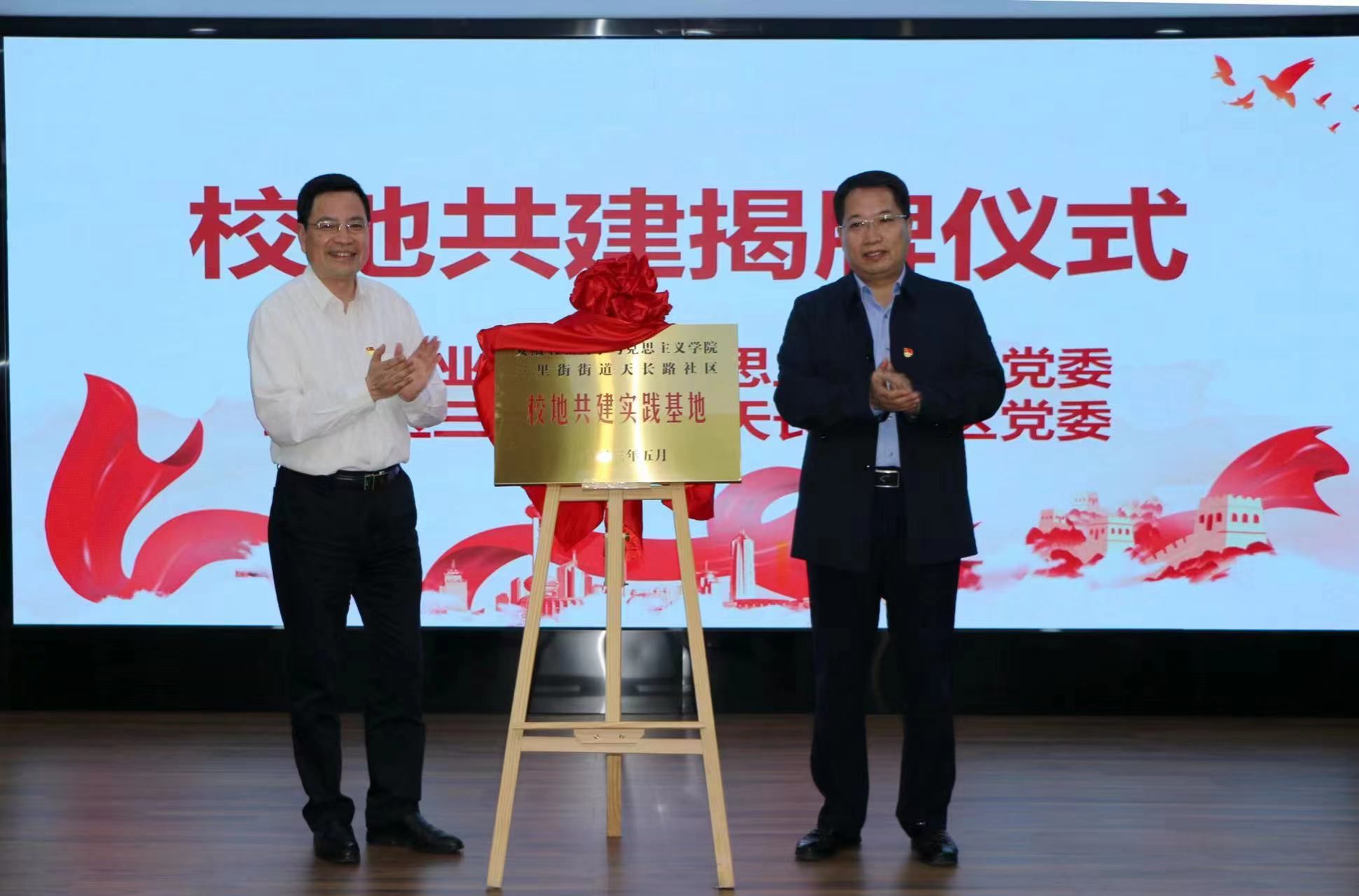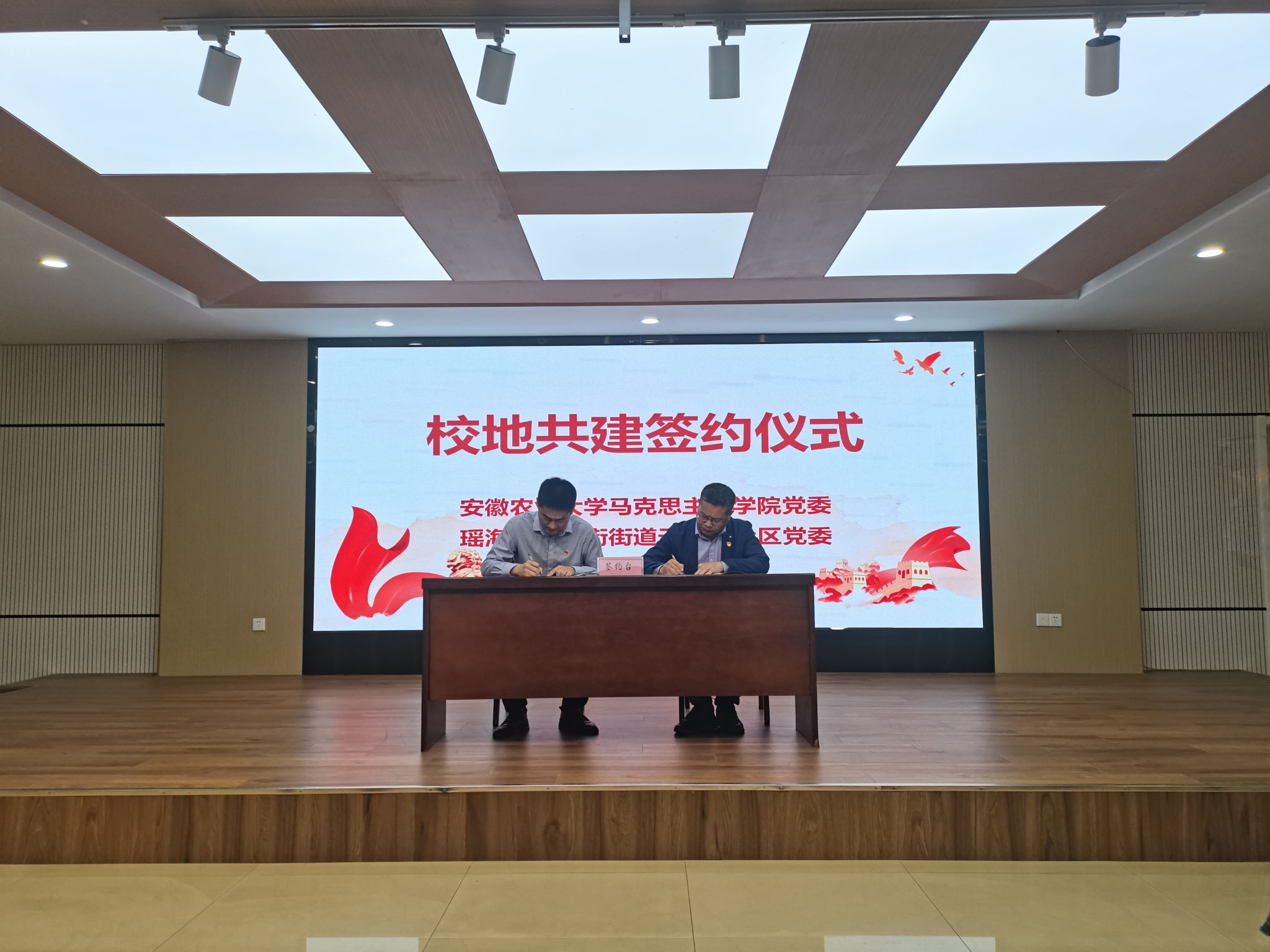 本网讯 5月11日下午,学院党委与合肥市瑶海区三里街街道天长路社区党委开展校地共建暨揭牌、签约仪式,并开展学习贯彻习近平新时代中国特色社会主义思想主题教育读书班第五次专题(联合)学习。瑶海区委常委、宣传部部长桑宝君,三里街街道党工委书记王劲松,三里街街道党工委副书记、办事处主任江德明,三里街街道党工委副书记王媛媛、学院党委书记孙超,党委副书记、纪委书记、副院长袁修雨以及安徽农业大学马克思主义学院学生党员代表参加学习共建活动。