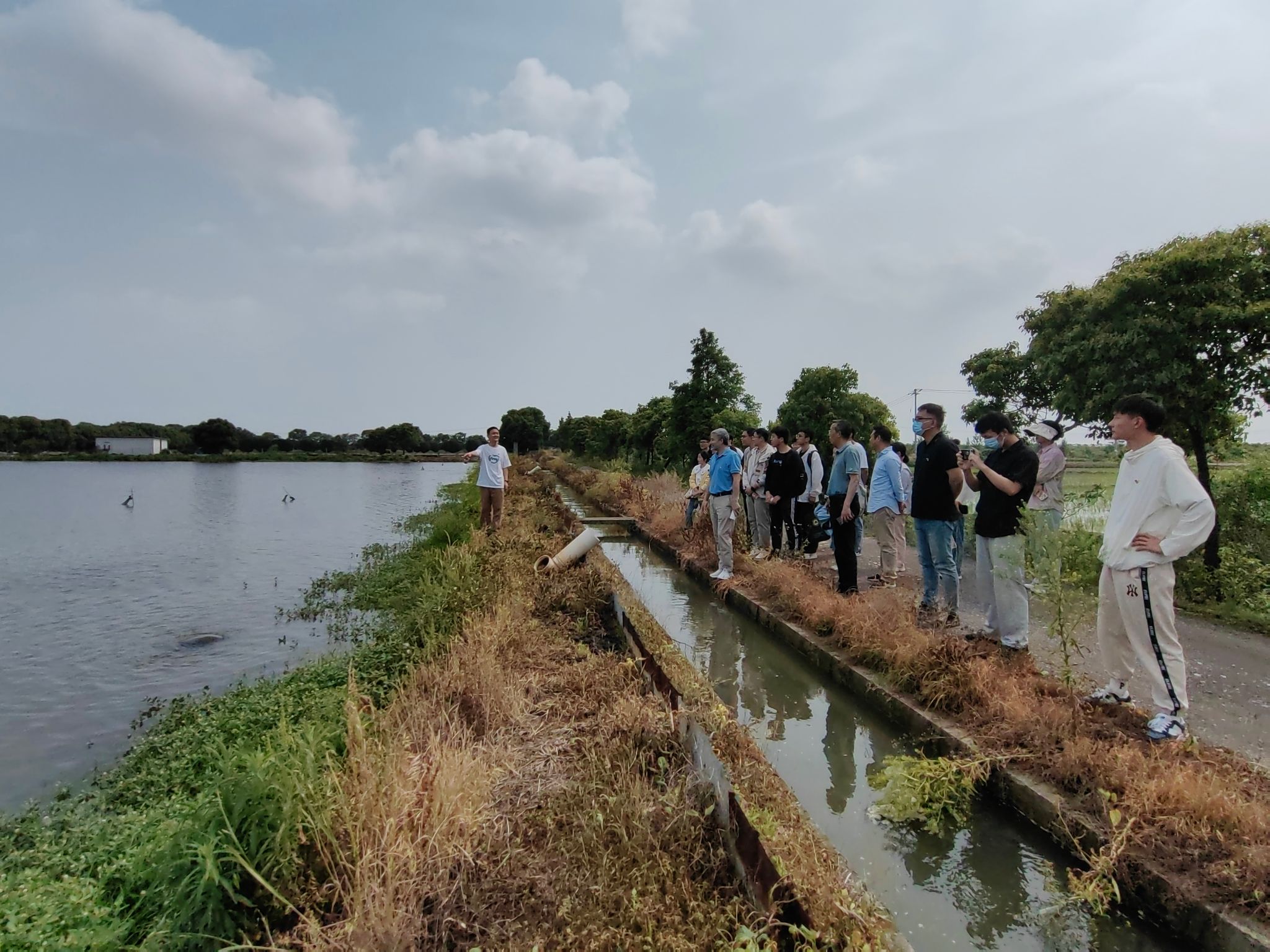 随后全体党员同志参观了巽风湖创业孵化基地。2020级作物生理生态团队许辉博士在稻虾田旁为师生分享了其在巽风湖创业孵化的故事,介绍稻虾共作模式的农事操作和田间管理要点。各位师生围绕水稻种植、杂草管理等问题在田间地头展开了热烈的讨论。