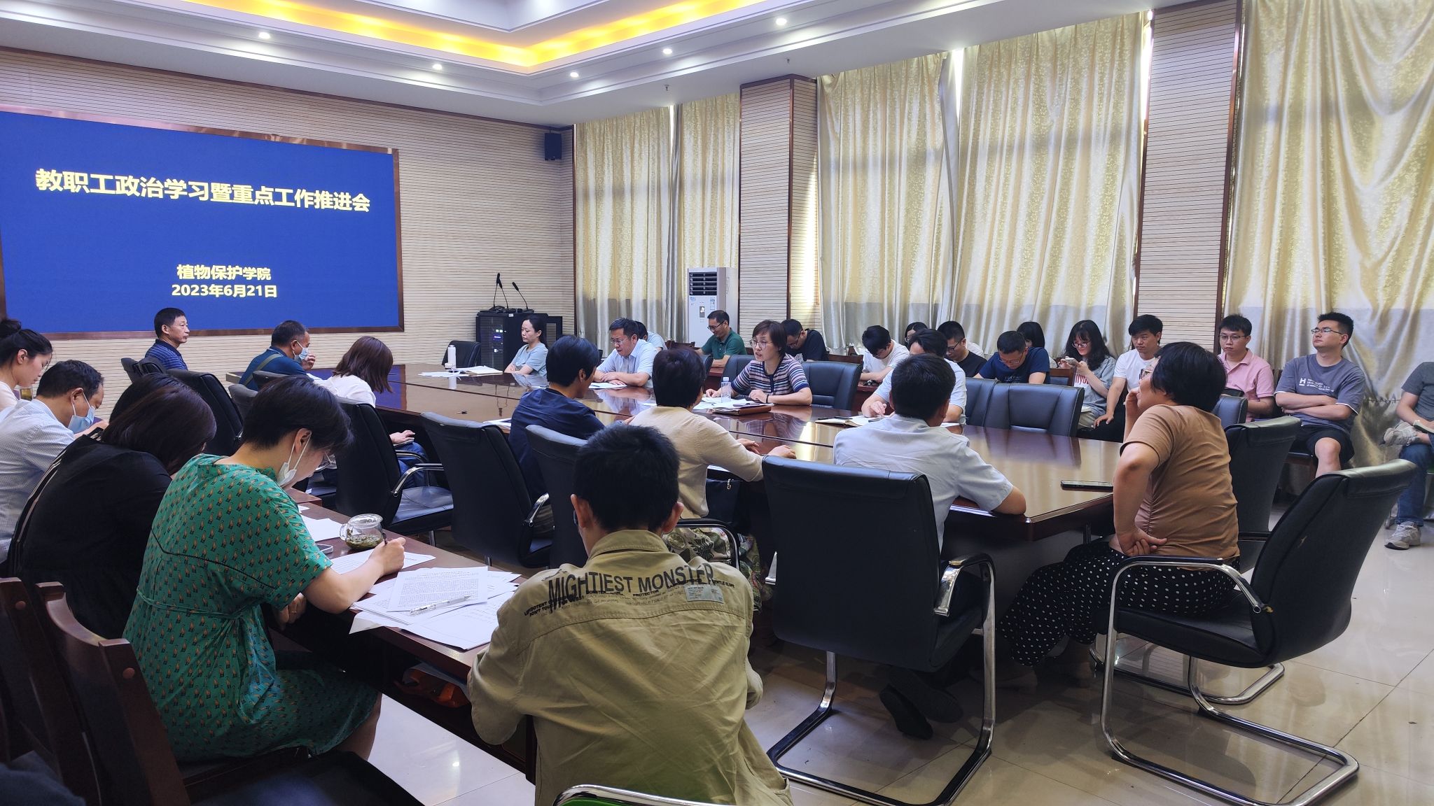 学深悟透强党性,凝聚共识谋发展。6月21日,植物保护学院在中西部大楼1213召开全体教职工政治学习暨重点工作推进会。学院党委书记刘柳传达了习近平总书记在文化传承发展座谈会上的重要讲话精神,领学了《求是》杂志发表的习近平总书记重要文章《中国式现代化是中国共产党领导的社会主义现代化》《总结推广浙江“千万工程”经验 推动学习贯彻习近平新时代中国特色社会主义思想走深走实》。