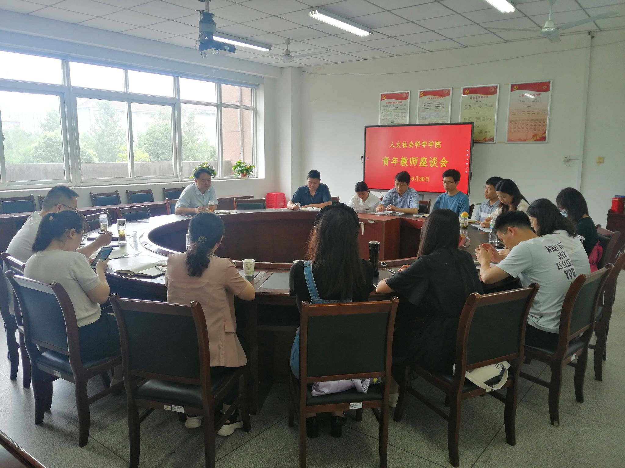 本网讯 为深入开展学习贯彻习近平新时代中国特色社会主义思想主题教育,以学促干,了解青年教师所思所想,推动学院事业发展走深走实,促进青年教师尽快成长成才,实现学院和教师个人发展的共赢,6月30日下午,人文社会科学学院在人文楼204会议室召开青年教师座谈会。座谈会由学院院长黄洪雷主持,学院分管科研工作副院长滕瀚、分管教学工作副院长单国雷参加座谈会。黄洪雷以“加强师德师风建设 共促教学科研发展”为题,结合学院教学、学科、科研、人才等方面工作,为青年教师上了一堂专题党课。