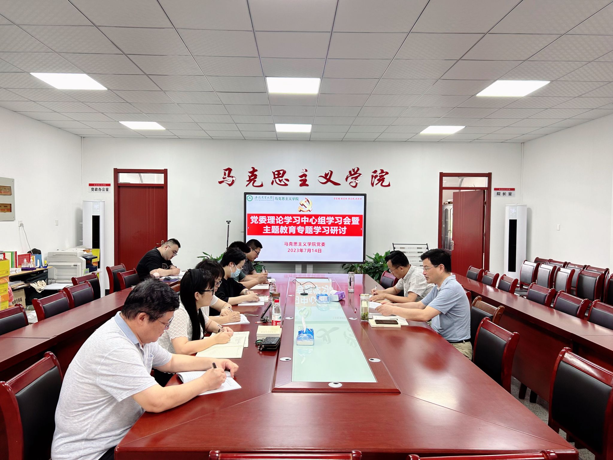 本网讯 7月14日上午,马克思主义学院党委理论学习中心组暨主题教育专题学习会在人文楼302会议室召开,党委书记孙超主持会议。党委副书记、院长方国武,各教师党支部书记、教研部(中心)主任参加会议。