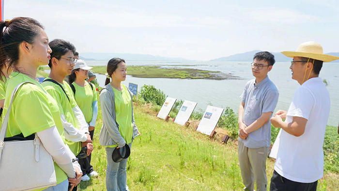 在安庆沿江重要生态保护区——菜子湖,实践团队正在与湿地生态保护协会工作人员交流访谈,深入了解菜子湖的基本概况、工作成效、工作亮点以及工作展望。“当看到菜子湖湿地保护核心区鸟类活动丝毫不受人类活动影响时,团队感到震撼和欣喜”,团队成员张紫涵表示,“这样的生态保护让我不得不竖大拇指”。在土地信息技术、湿地景观生态、湿地生物多样性保护、资源环境管理与评价方面专家王成副教授的带领下,实践团队深入调研学习菜子湖国家湿地公园环境保护和发展瓶颈,为调研中发现的生态环境保护资金短缺、群众不理解等问题提出了可行性意见建议,得到了地方政府的肯定。