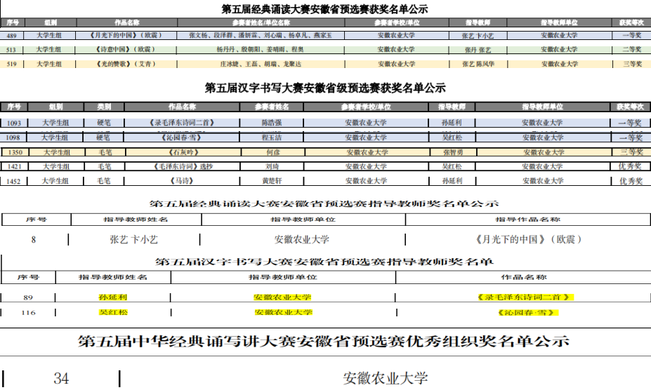 本网讯 近日,第五届中华经典诵写讲大赛安徽省预选赛获奖名单公布,我校师生在本次大赛中斩获佳绩,荣获一等奖3项、二等奖1项、三等奖2项、优秀奖2项,孙延利、吴红松、张艺、卞小艺等4位老师获指导教师奖,学校获优秀组织奖。3项一等奖作品将由省教育厅推荐参加全国比赛。