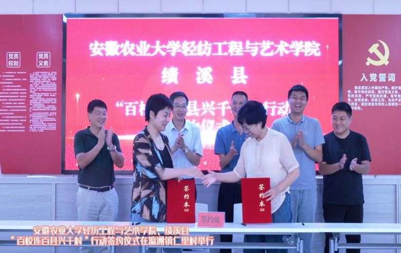 本网讯 8月9日下午,轻纺工程与艺术学院与绩溪县在瀛洲镇仁里村举行校地合作暨“百校连百县兴千村”行动合作协议签约仪式。轻纺工程与艺术学院党委书记夏成云、副院长周晓娟,绩溪县委常委、副县长陈俊义、乡村振兴局副局长冯瑞虹出席签约仪式,周晓娟与冯瑞虹分别代表双方在合作协议书上签字。